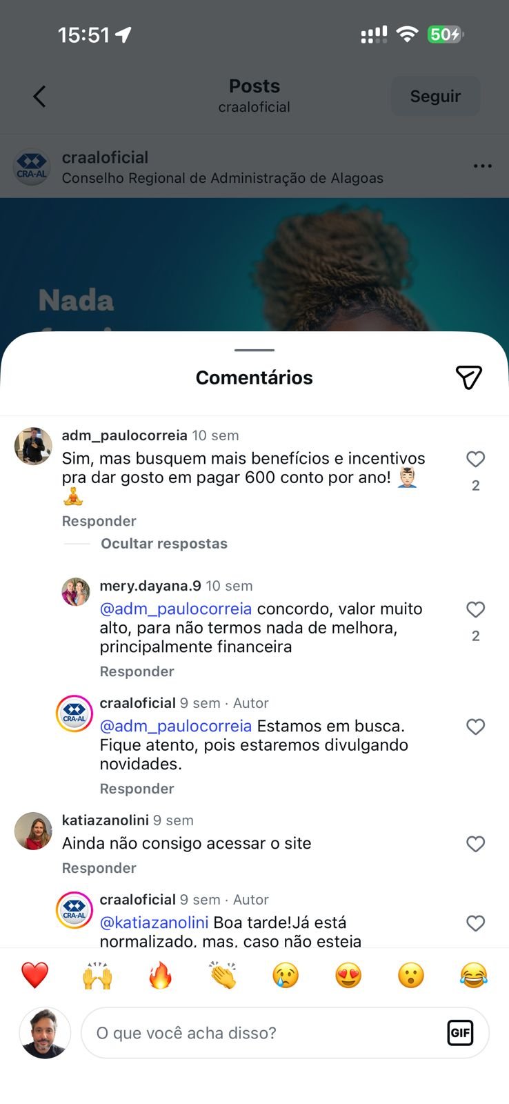 As manifestações, feitas principalmente em canais abertos e perfis institucionais, evidenciam a pressão enfrentada pela atual gestão do CRA-AL. Especialistas avaliam que o desafio da instituição é alinhar a arrecadação com maior transparência e investir em soluções que atendam às demandas tecnológicas da categoria.