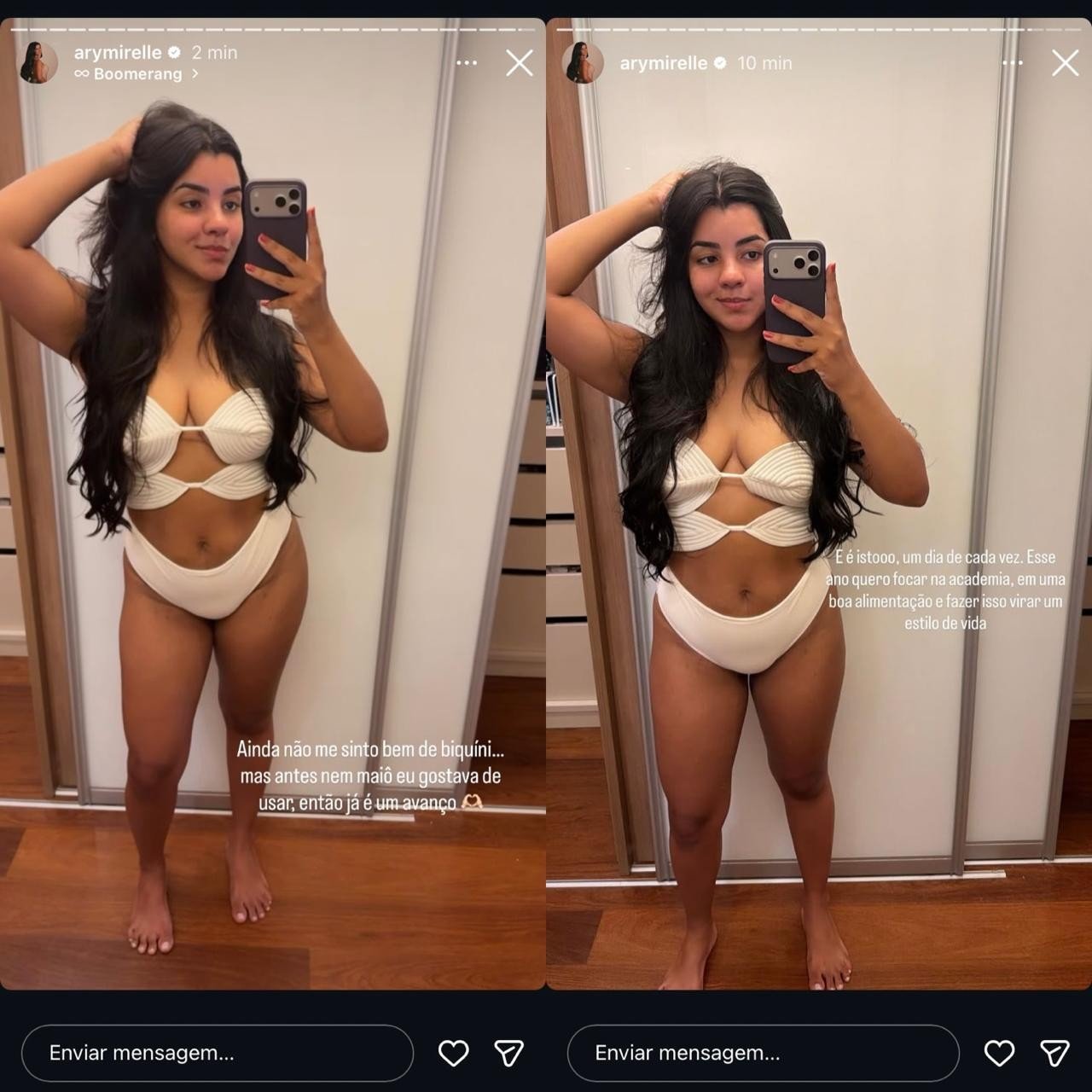 Ary Mirelle, de 23 anos, fez uma selfie no espelho vestido um maiô com recortes, nesta quinta-feira (5). A esposa de João Gomes compartilhou a foto em seu Instagram com uma reflexão sobre sua autoimagem. “Ainda não me sinto bem de biquíni, mas antes nem maiô eu gostava de usar, então já é um avanço. Um dia de cada vez. Este ano quero focar na academia, em uma boa alimentação e fazer isso virar um estilo de vida”, escreveu.Posts de Ary MirelleReprodução | InstagramA influencer tem se dedicado para transformar a forma física depois das gestações, com curtíssimo tempo entre uma e outra. Ela e o cantor são pais de Jorge, de 2 anos, e Joaquim, de cinco meses.João Gomes e Ary Mirelle celebram 4 meses de Joaquim com tema Bob Esponja e filhos fantasiadosReprodução/ Instagram”Ainda sou muito insegura, mas isso é normal. Acabei de ter bebê”, ponderou. “Antes de Jorge eu já era muito insegura em usar biquíni. Desde a minha adolescência. Mas era besteira, mesmo que eu fosse mais magrinha. Agora tenho mais insegurança, mas isso vai passar. Por isso quero focar, para me sentir bem comigo mesma e deixar essas inseguranças de lado”, explicou.ASSISTA AO VÍDEO: