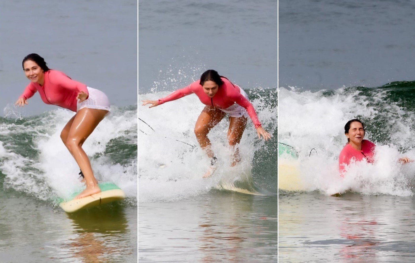 Carol Portaluppi treina manobras de surfe e leva ‘caldo’ em praia carioca
