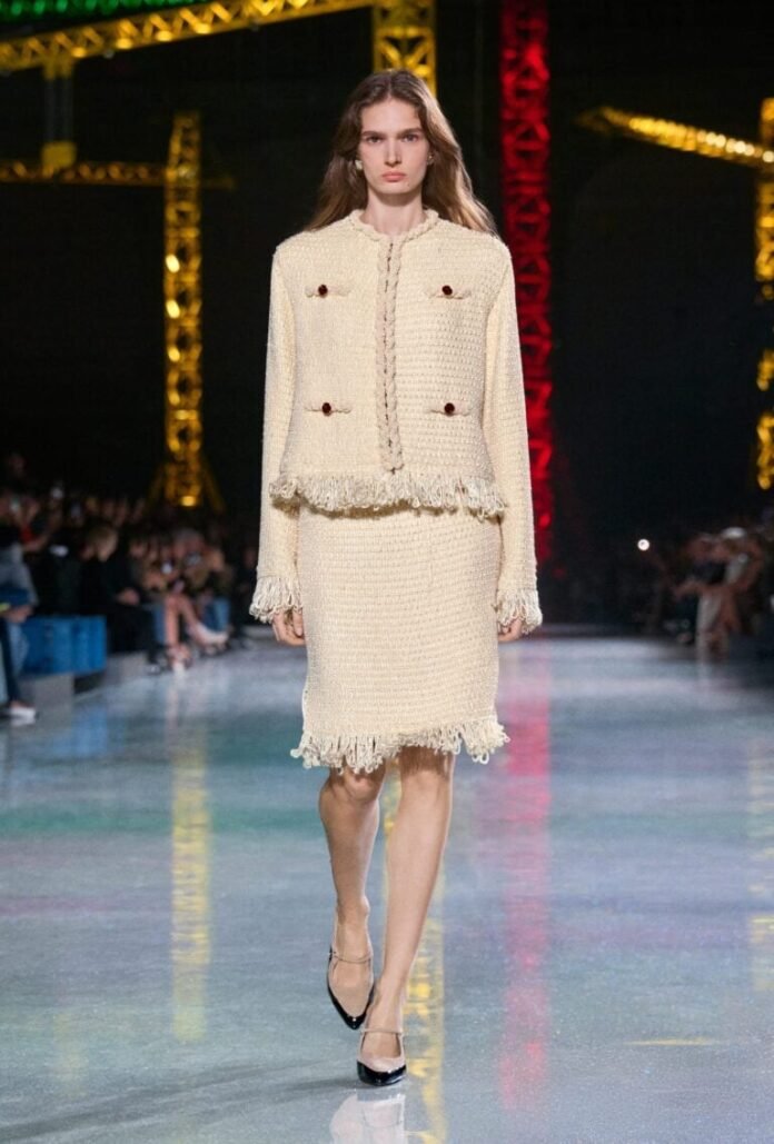 Na noite da segunda-feira (09/03), ao entrar no Grand Palais para o desfile da Chanel, gruas coloridas pontuavam o cen?rio enquanto a o ru?do de bate-estacas se infiltrava entre as faixas “Just Dance” de Lady Gaga e “Petit Pays” de Ces?ria ?vora na trilha sonora. A gente logo entendeu o recado: atrav?s do novo olhar de Matthieu Blazy, estamos diante de uma obra em constru??o, um work in progress que marca a segunda cole??o de ready-to-wear do estilista ? frente da maison francesa. A primeira, que desembarcou nesta semana com exclusividade na boutique da Rue Cambon, em Paris, j? tem pe?as sold out ? o vestido que usei para assistir o show ontem ? o look 50 da estreia do estilista no pr?t-a-porter da marca.