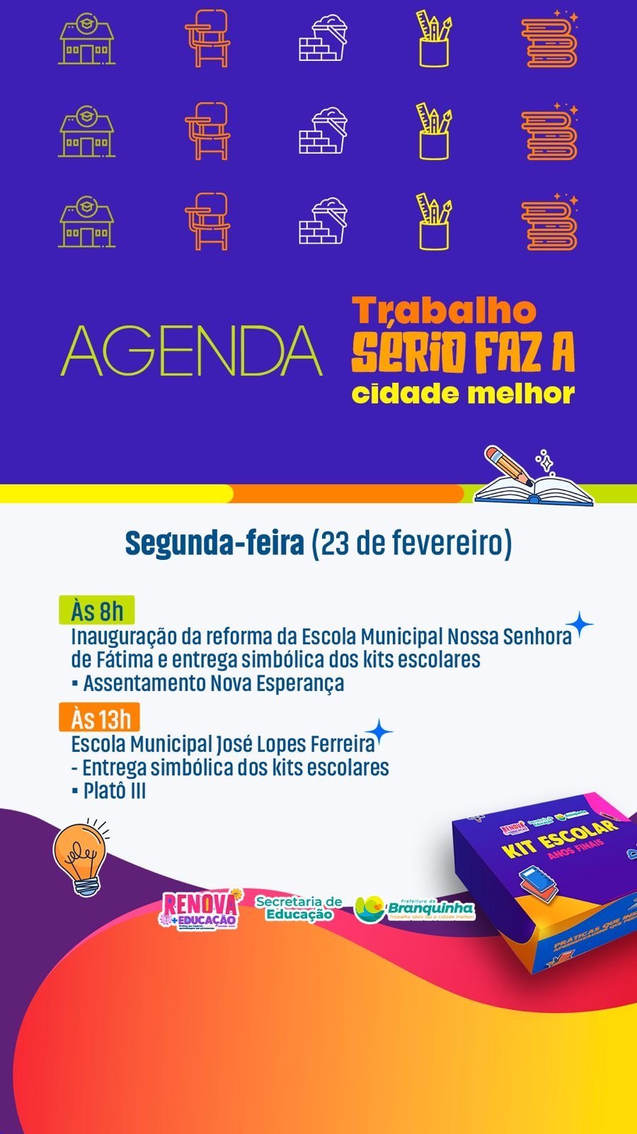 Seguindo com a reestruturação completa de todas as Unidades Escolares do município, o prefeito de Branquinha, Neno Freitas, irá entregar na próxima segunda-feira (23), a Escola Nossa Senhora de Fátima, localizada no Assentamento Nova Esperança. Na ocasião, que também marca a volta às aulas da rede de ensino, o gestor entregará os kits escolares da educação infantil à educação de jovens e adultos.