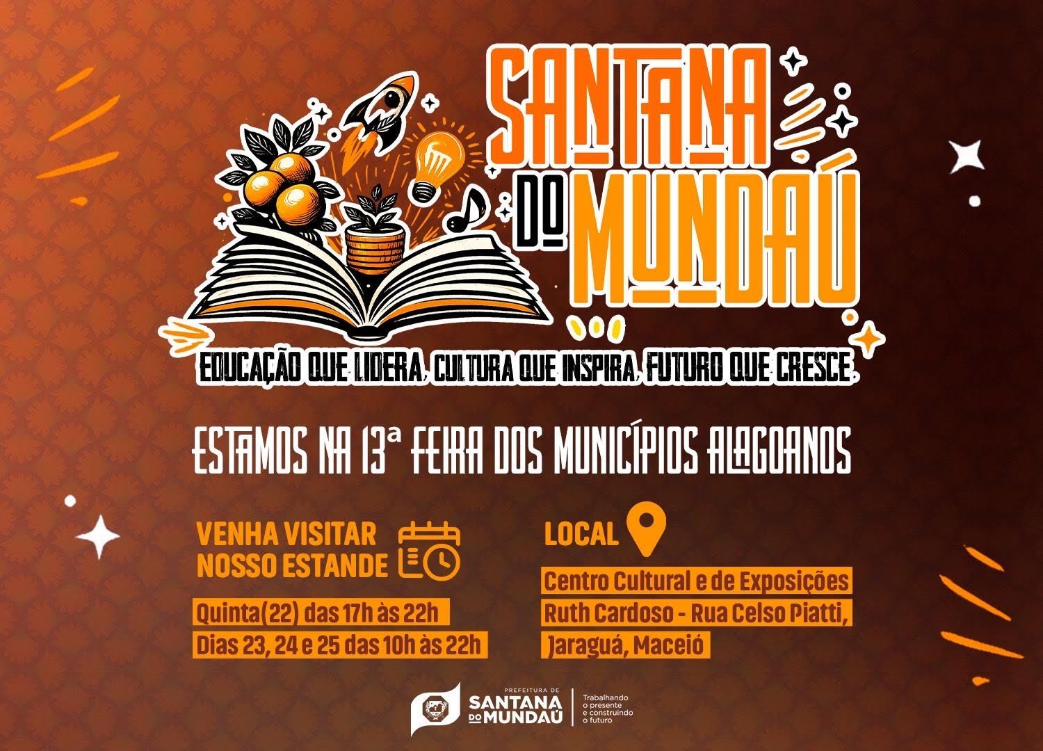 Entre os dias 22 e 25 de janeiro, o Centro de Convenções em Maceió, será palco da 13ª edição da Feira dos Municípios Alagoanos. Realizada pela AMA – Associação dos Municípios Alagoanos, a prefeitura de Santana do Mundaú também conta com um estande no local.