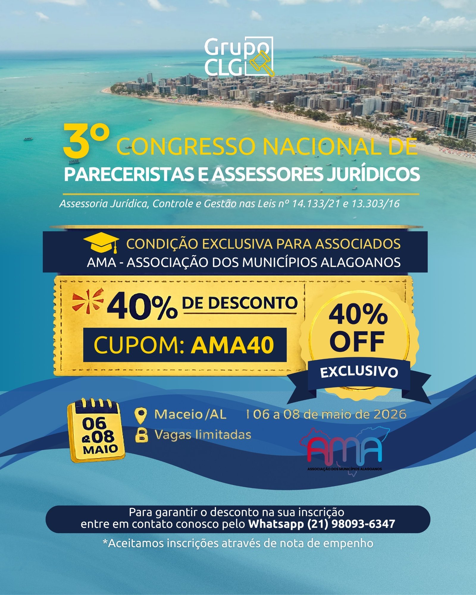 Maceió sediará, entre os dias 6 e 8 de maio de 2026, o 3º Congresso Nacional de Pareceristas e Assessores Jurídicos, um dos principais encontros do país voltados à atuação jurídica na administração pública. O evento será realizado no Centro de Convenções da capital alagoana, com participação presencial e on-line.
