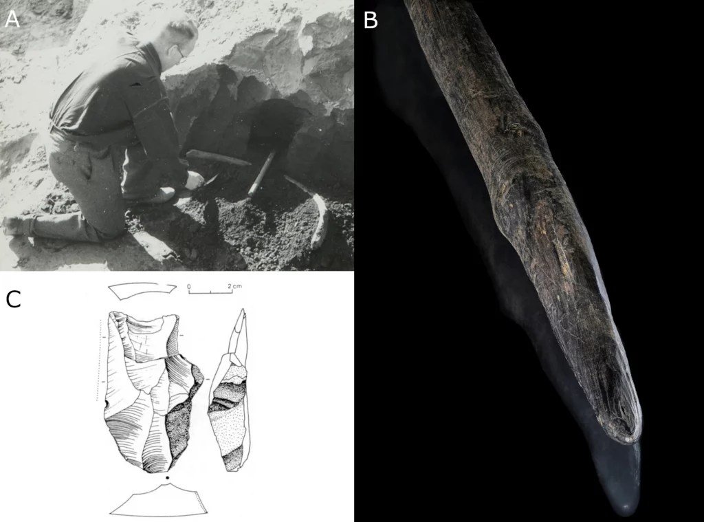 Vest?gios arqueol?gicos de Lehringen: lan?a de madeira e artefato de s?lex encontrados junto aos restos de um elefante pr?-hist?rico. Cr?dito: Verheijen, I., et al. (2026). Scientific Reports. Adaptado de NLD (A), foto de Volker Minkus (B) e Thieme & Veil (1985) (C).