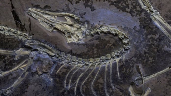 Fóssil de Archaeopteryx, criatura que viveu há cerca de 150 milhões de anos na Europa. Com dentes, garras nas asas e uma longa cauda óssea, ele é um ícone da transição entre dinossauros e aves, e por mais de um século foi o único registro conhecido desse período. Imagem: Delaney Drummond/Field Museum