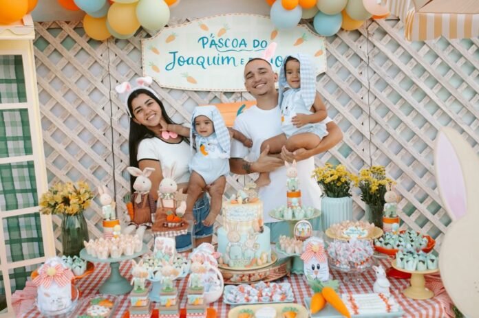 O cantor João Gomes, de 23 anos de idade, e a esposa, a influenciadora Ary Mirelle, de 24 anos, celebraram os 6 meses do filho caçula, Joaquim, com uma festa com tema de Páscoa, data que, este ano, será celebrada no dia 5 de abril. Na comemoração, claro, ainda estava o primogênito do casal, Jorge, de 2 anos.”Seis meses de Quim Quim com Páscoa de Jorge e Joaquim”, escreveu o casal, na noite deste sábado (7), no Instagram. Além da decoração caprichada, com vários coelhinhos, os pequenos ainda deram um show de fofura fantasiados do animalzinho símbolo da data, com direito a capuz com orelhinhas de coelho o que, claro, encantou muitos internautas. “Ownnn, que coisa mais lindaaaaaaaa. Parabéns pelos 6 meses de Quim Quim”, comentou uma seguidora. “Amo amo amoooo”, “o Jorge está amando essas festinhas todo mês”, “Ary, ele está crescendo muito rápido”, “que coisa mais lindaa” e “Deus continue abençoando Joaquim e Jorge com muita saúde e uma vida linda!! Que festa mais linda” também foram comentários deixados no post. Ary Mirelle e João Gomes com os filhos, Jorge e JoaquimReprodução/InstagramAry Mirelle e João Gomes com os filhos, Jorge e JoaquimReprodução/InstagramAry Mirelle e João Gomes com os filhos, Jorge e JoaquimReprodução/InstagramAry Mirelle e João Gomes com os filhos, Jorge e JoaquimReprodução/InstagramAry Mirelle e João Gomes com os filhos, Jorge e JoaquimReprodução/InstagramAry Mirelle e João Gomes com os filhos, Jorge e JoaquimReprodução/InstagramAry Mirelle e João Gomes com os filhos, Jorge e JoaquimReprodução/InstagramAry Mirelle e João Gomes com os filhos, Jorge e JoaquimReprodução/InstagramAry Mirelle e João Gomes com os filhos, Jorge e JoaquimReprodução/Instagram