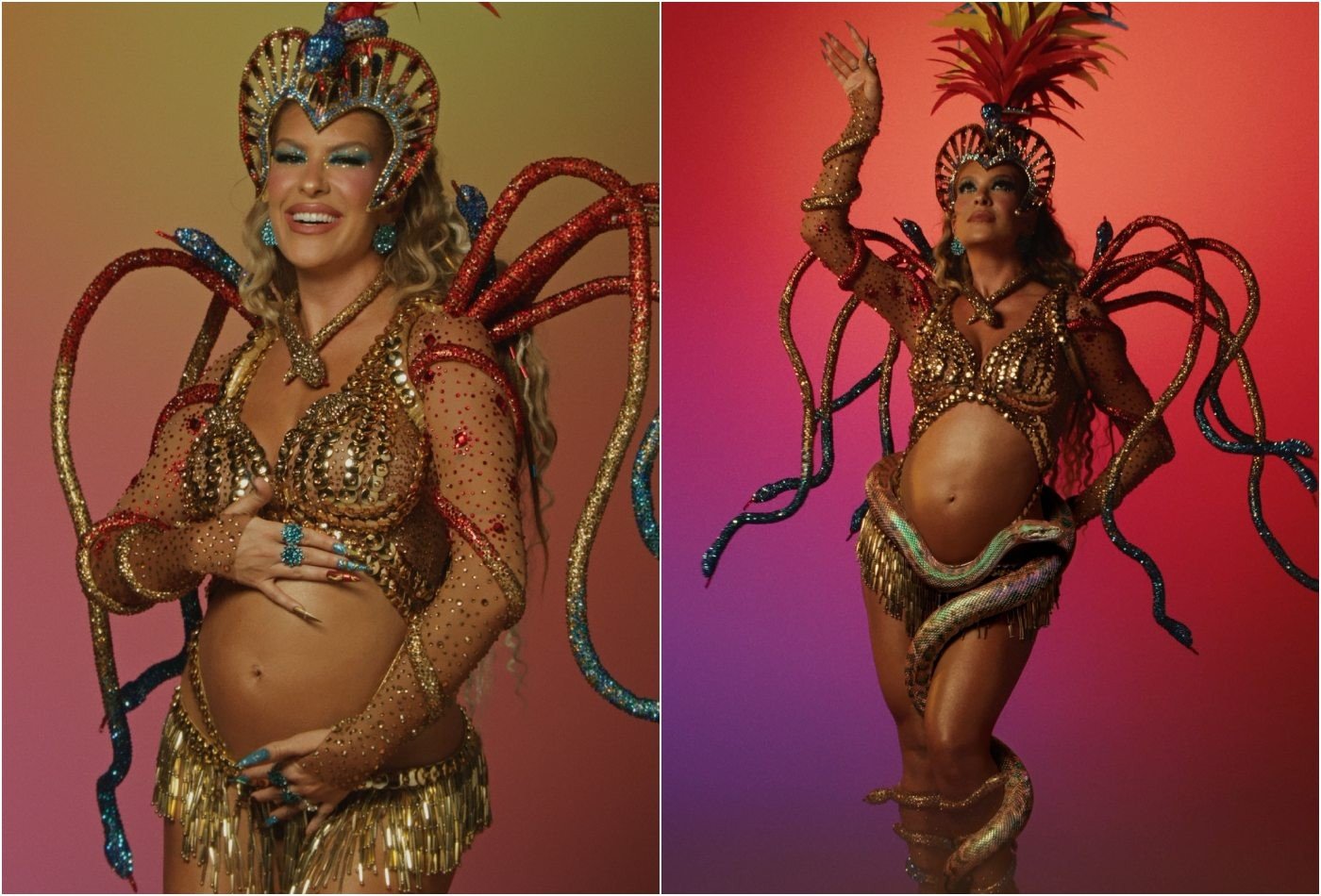 Lore Improta elegeu uma fantasia com a barriga de gravidez à mostra para desfilar pela Viradouro na madrugada da terça-feira (17), na Marquês da Sapucaí. A musa da escola no Carnaval do Rio de Janeiro está grávida de um menino, o segundo filho com o cantor Léo Santana, com quem tem Liz, de quatro anos. A gestação foi planejadíssima para ela poder desfilar pela primeira vez grávida. “Planejei tudo. Eu olhava para o Leo e falava, ‘hoje é o dia, amor, vamos nessa’. Ele falava: ‘que negócio chato assim programado (risos)’. Mas tinha que ser assim porque se passasse de mês, eu não ia poder engravidar mais por causa do Carnaval. A gente tinha uma data limite. Minha médica não queria que eu estivesse durante os três primeiros meses no Carnaval. Então, foi planejado pensando na nossa Copa do Mundo, que é o Carnaval”, contou ela. Lore vem representando a serpente Dangbé, símbolo de um ano que a Viradouro levou muito da Bahia pra Avenida e foi conduzido com maestria pelo Mestre Ciça, homenageado este ano pela escola.A fantasia, assinada pelo stylist Thiago Setra, traz como conceito o nascimento da força a partir do ninho da serpente, símbolo de proteção, resistência e vitória,”Estou muito feliz por viver esse momento tão especial. Desfilar sempre foi uma emoção enorme para mim, e agora, grávida, tudo ganha um significado ainda mais forte. Quero aproveitar cada segundo com muita leveza, curtir a energia da avenida para celebrar essa fase. Para além disso poder homenagear o Mestre Ciça com a Viradouro é uma grande honra.”, disse Lore.Neste a Viradouro homenageia o mestre Ciça com o enredo Pra Cima, Ciça!. O diretor de bateria passou por várias escolas, entre elas a Viradouro, de 1999 a 2009, onde seu trabalho foi reconhecido pela inovação no Carnaval de 2007, quando a bateria desfilou até o recuo em cima de um carro alegórico.Galerias Relacionadas