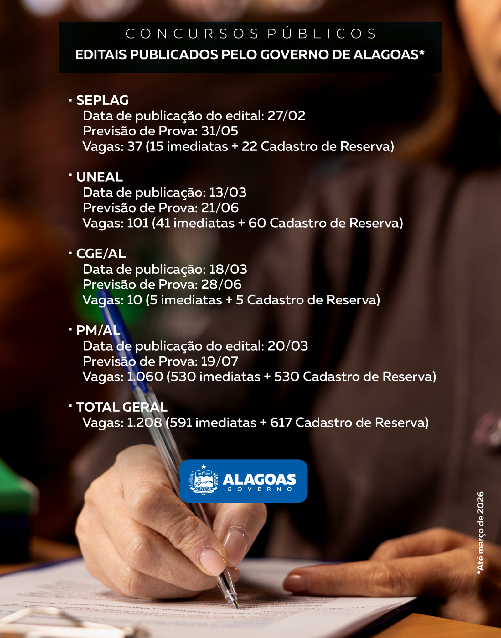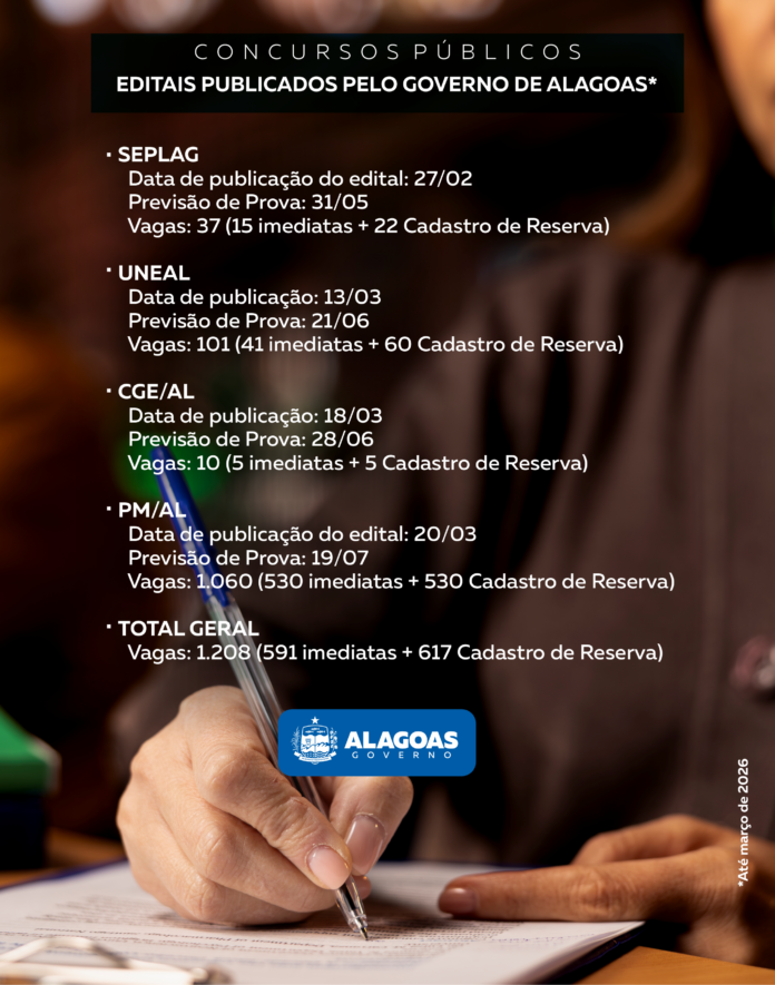 O Governo do Estado iniciou 2026 lançando o maior ciclo de concursos públicos da história de Alagoas. Os certames contribuem com áreas estratégicas da administração estadual. Ao todo, quatro editais já foram publicados até março, somando 1.208 vagas, entre oportunidades imediatas e formação de cadastro de reserva.