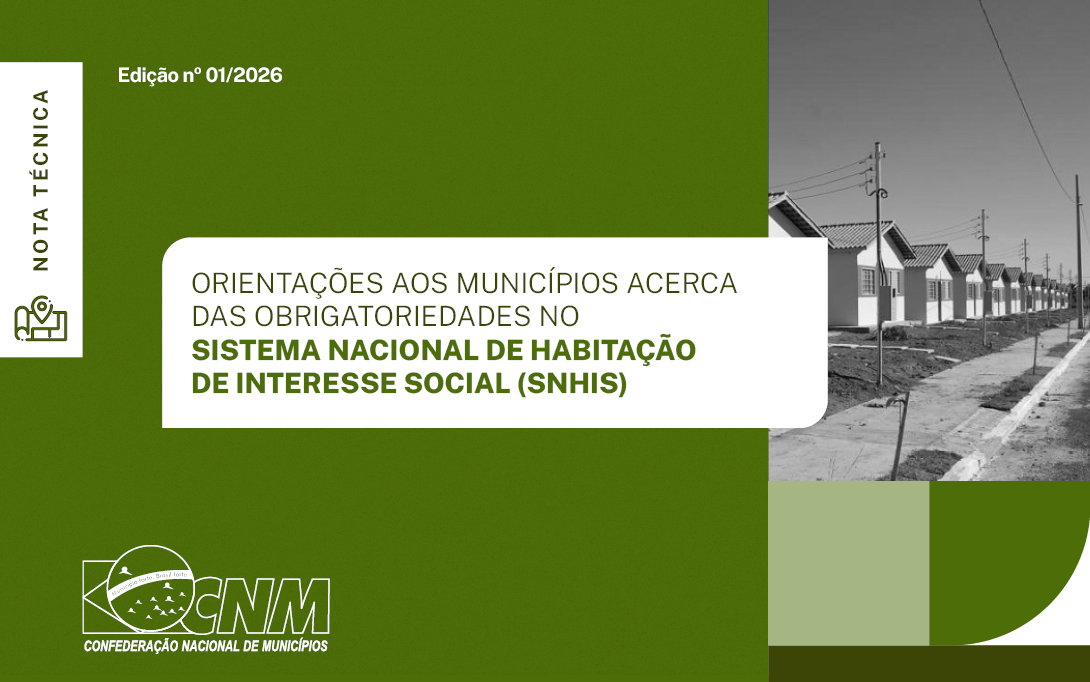 A Confederação Nacional de Municípios (CNM) divulga a Nota Técnica 01/2026, que orienta e alerta as equipes municipais sobre os procedimentos de regularização no Sistema Nacional de Habitação de Interesse Social (SNHIS), instituído pela Lei 11.124/2005, e traz recomendações para aprimorar a gestão habitacional local. Na oportunidade, a entidade apresenta um panorama da participação dos Municípios no sistema, em que 97,5% (5.430) já realizaram a adesão, contudo, apenas 26,2% (1.423) estão regulares, ou seja, sem pendências em nenhum dos instrumentos exigidos. Na publicação consta os links para consulta da situação.