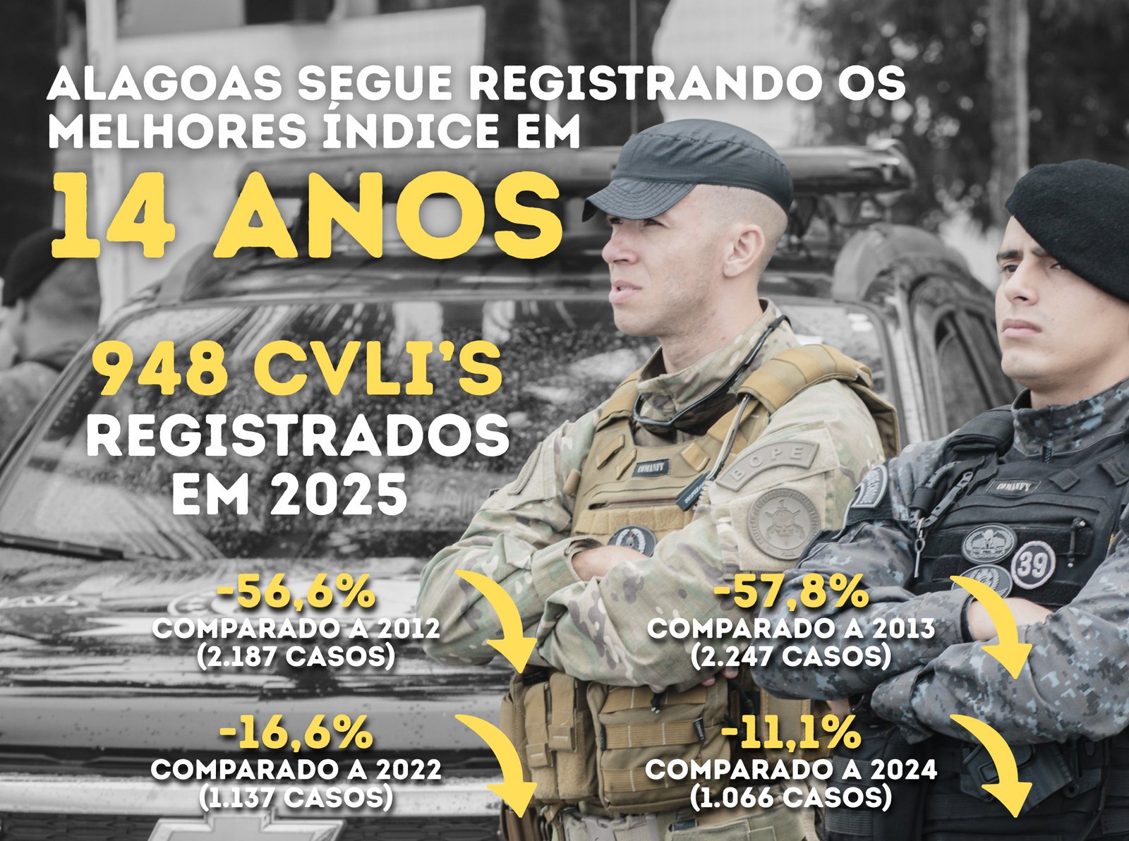 Alagoas também registrou em 2025 o melhor dezembro dos últimos 14 anos, com 81 CVLIs. Em relação a 2012 (195 casos), a redução foi de 58,5%, e no comparativo com o ano anterior (97 crimes), a queda foi de 16,5%.