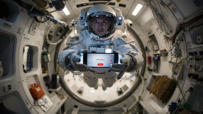 Uso de smartphones facilita registros, reduz custos e melhora bem-estar astronauta ? Imagem criada por intelig?ncia artificial (ChatGPT / Olhar Digital)