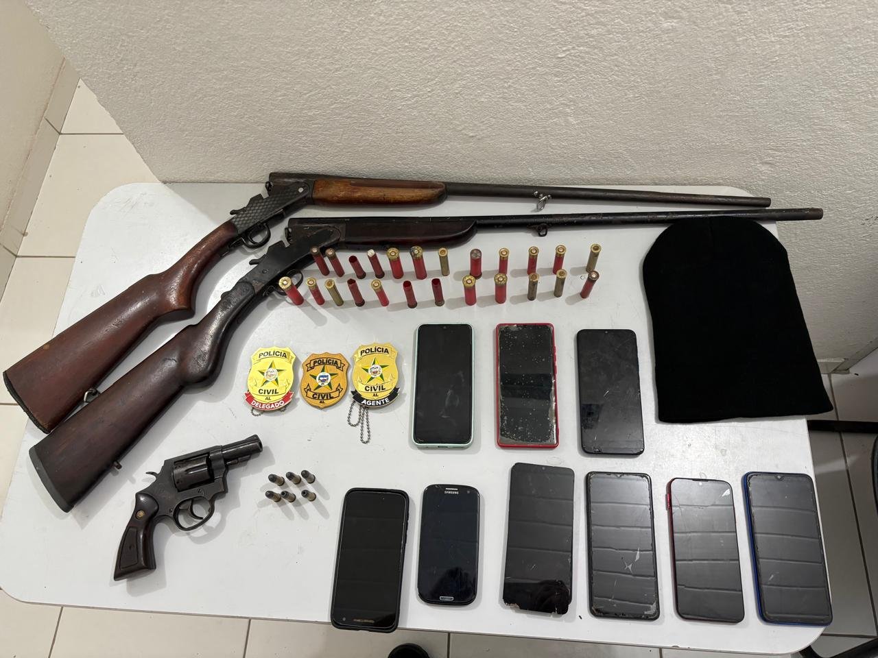 “Além das armas e munições, os policiais encontraram diversos aparelhos celulares de origem desconhecida e uma balaclava. Os materiais indicam que os investigados podem estar envolvidos em outros crimes na região do povoado Reforma, em São Luís do Quitunde”, explicou o delegado.