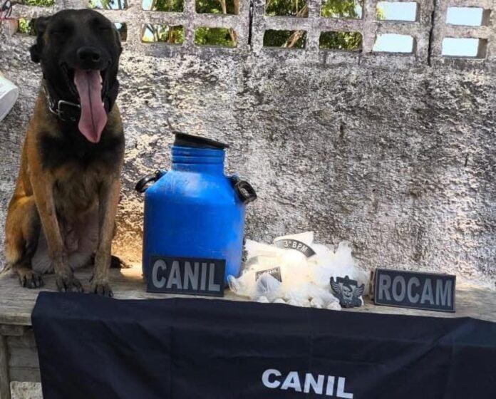 Após a escavação, os militares localizaram um recipiente enterrado contendo aproximadamente 1.550 pinos de cocaína (cerca de 1,1 kg) e 300 pedras de crack.