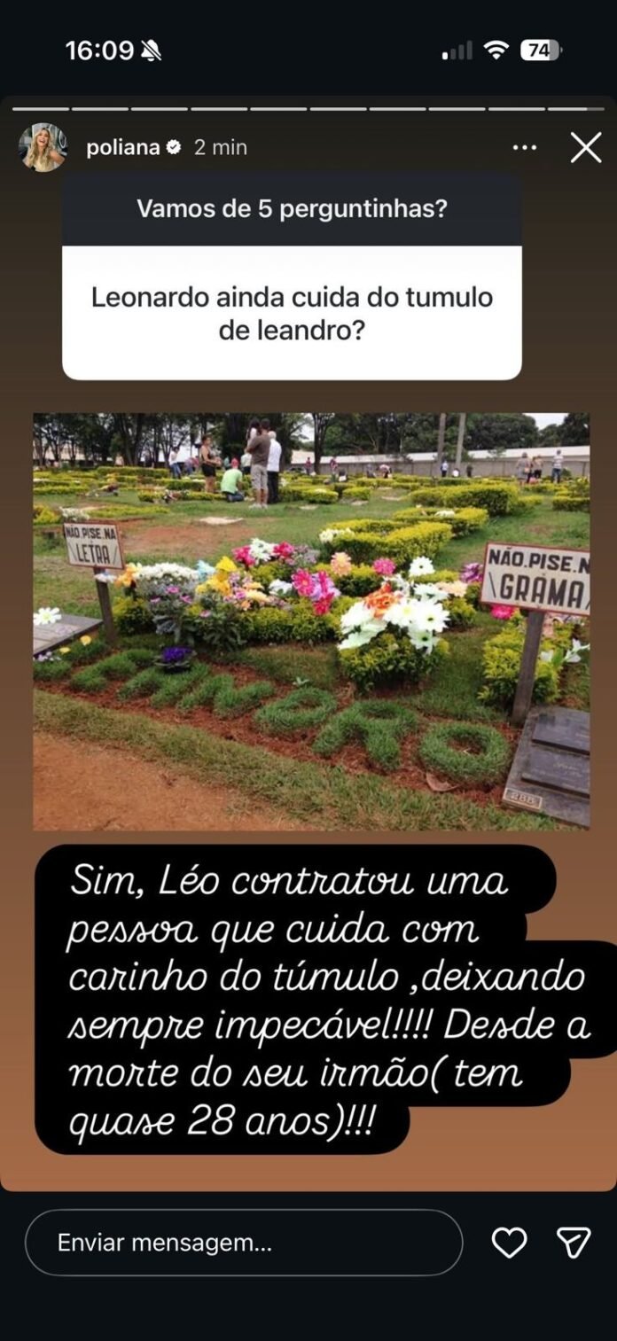 Poliana Rocha fala sobre como Leonardo cuida do tumulo do irmão, Leandro. Ela falou nos stories neste domingo (8).Poliana Rocha fala sobre tumulo do cunhado, LeandroReprodução/Instagram