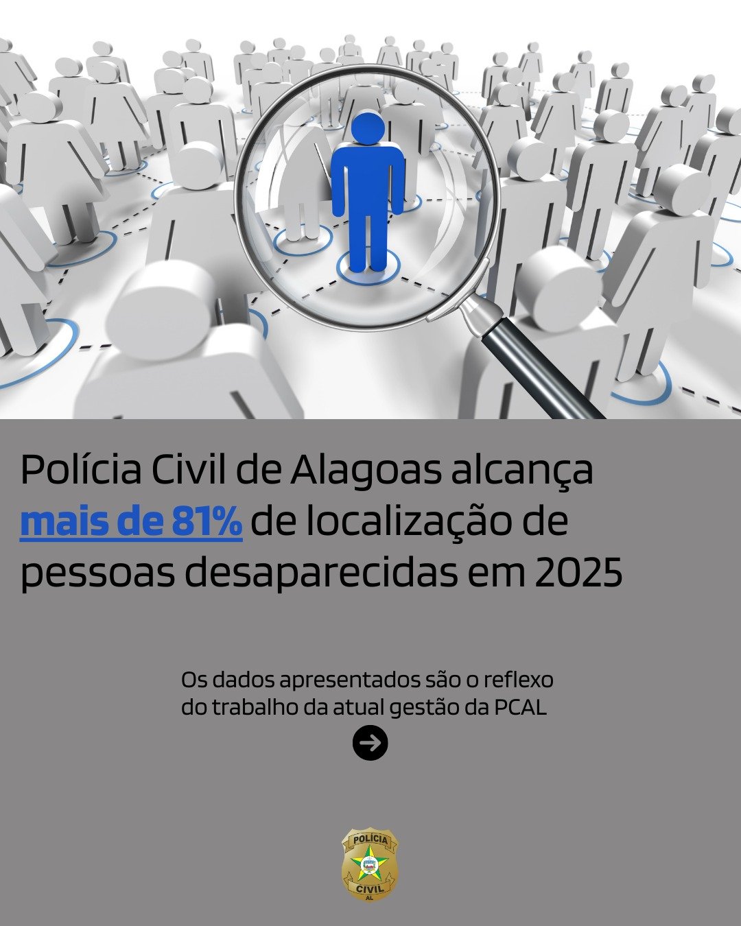 Em 2025, foram registradas 796 pessoas desaparecidas em Alagoas, das quais 650 foram localizadas, alcançando uma taxa estadual de localização de 81,65%, considerada elevada e indicativa da efetividade do trabalho contínuo desenvolvido pelas equipes especializadas.