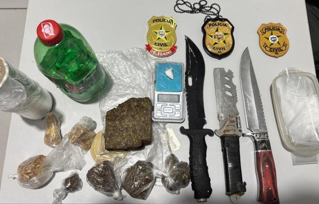No imóvel, foram apreendidos aproximadamente 100 gramas de crack, 249 gramas de maconha e 1 grama de cocaína. Também foram encontrados uma balança de precisão, três punhais, diversas embalagens utilizadas para acondicionamento de drogas e cerca de 0,5 litro de uma substância conhecida como “loló” ou “lança perfume”.