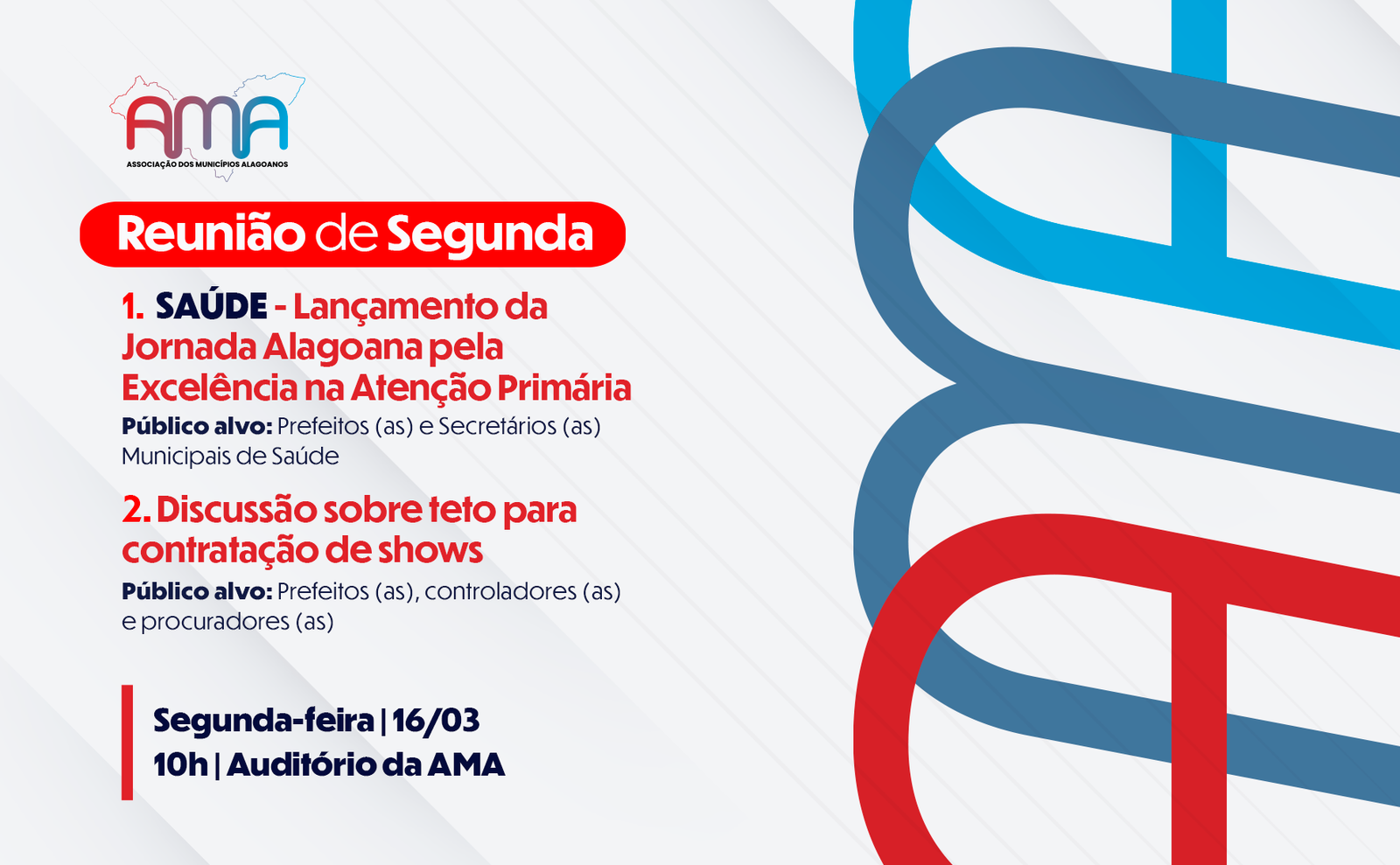 A Associação dos Municípios Alagoanos (AMA) realiza, na próxima segunda-feira (16), às 10h, reunião com prefeitos, prefeitas e equipes técnicas municipais para discutir temas importantes da gestão pública. Entre os pontos da pauta estão o debate sobre a criação de parâmetros para contratação de shows pelas prefeituras e o lançamento da Jornada Alagoana pela Excelência na Atenção Primária, iniciativa voltada ao fortalecimento da saúde nos municípios.