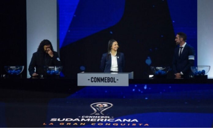 DANIEL DUARTE / AFP / Luciana Antunez (C), gerente de competições da Conmebol, conduz o sorteio da fase de grupos da Copa Sul-Americana ao lado dos ex-jogadores de futebol René Higuita (E), da Colômbia, e Diego Godín, do Uruguai, em Luque, Assunção.