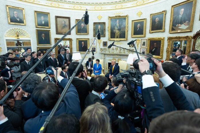 O presidente dos EUA, Donald Trump, se reuniu na Casa Branca com a primeira-ministra japonesa, Sanae Takaichi, nesta quinta-feira (19), ocasião na qual descartou o deslocamento de tropas americanas ao Oriente Médio.